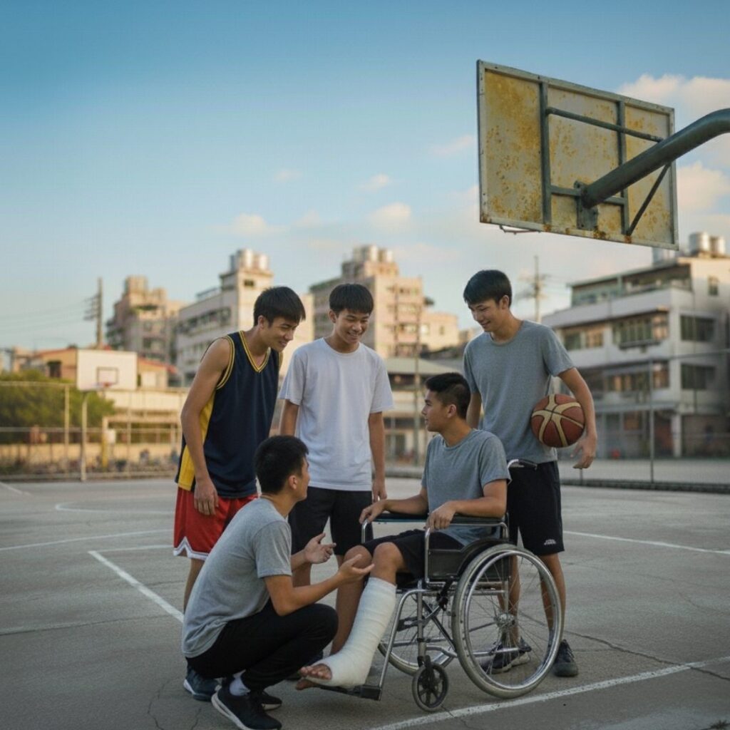 在輪椅上,我只能抬頭仰望每一個人。走廊上那些同情或好奇的眼神,以及「真是可憐」、「以後不能打球了吧」的竊竊私語,都像尖銳的刺。我試圖表現得若無其事,但內心早已被灼傷。