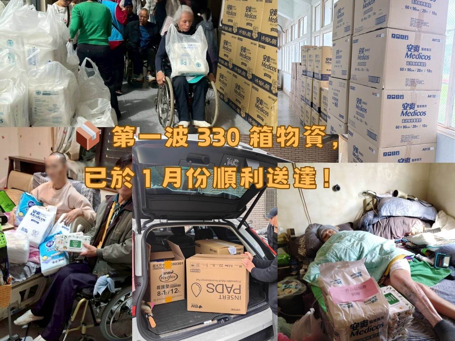 在寒冬之際,我們沒有停下腳步。已於 2026 年 1 月份 順利送出第一批救援物資。 這 332 箱 沉甸甸的包裹,裝載的不僅是 1,800 包 的紙尿布、看護墊與濕紙巾,更是來自社會大眾最直接的關懷。透過與在地社福機構的緊密合作,我們將這份愛精準地送到了最急迫需要的弱勢朋友手中。